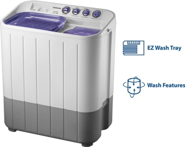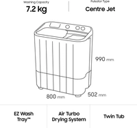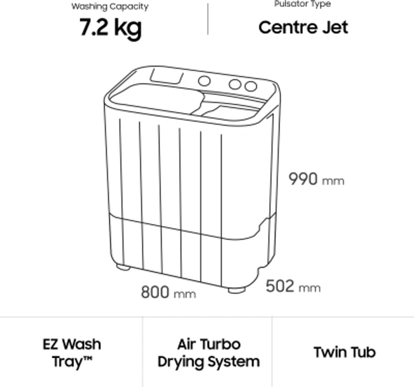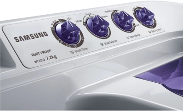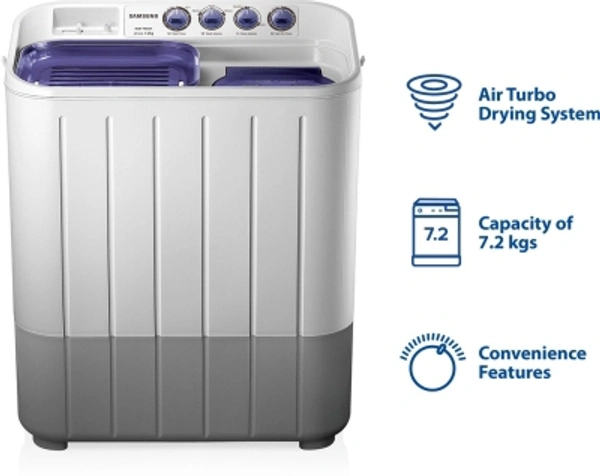 SAMSUNG 7.2 kg with Double Storm Technology Semi Automatic Top Load WhiteColor: DA White, Light Grey, VIOLET, WhiteCapacity: 6 kg, 6.5 kg, 7.2 kg, 8.5 kgStar Rating: 5, Non-RatedSemi Automatic Top Load740 rpm : Higher the spin speed, lower the drying time7.2 kg10 Days Replacement Policy, No questions asked.