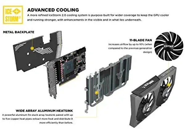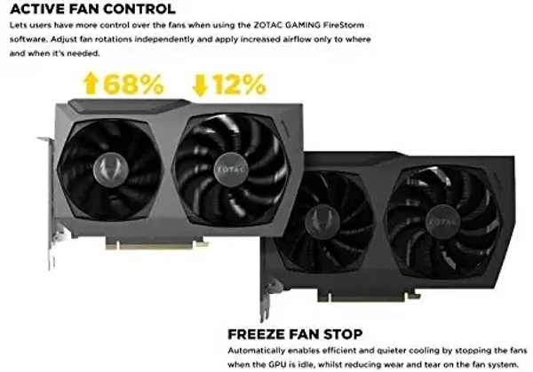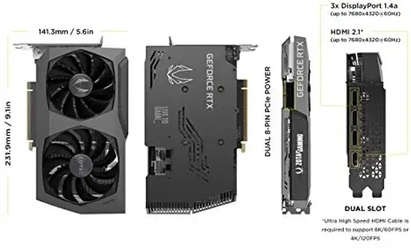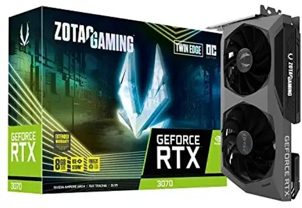 BrandZotac Graphics CoprocessorNVIDIA GeForce RTX 3070 Video Output InterfaceDisplayPort, HDMI Graphics Processor ManufacturerZOTAC Graphics RAM TypeGDDR6 Graphics RAM Size8 GB NVIDIA Ampere architecture, 2nd Gen Ray Tracing Cores, 3rd Gen Tensor Cores 8GB 256-bit GDDR6, 14 Gbps, PCIE 4.0; Boost Clock 1755 MHz White LED Logo Lighting, IceStorm 2.0 Advanced Cooling, Freeze Fan Stop, Active Fan Control, Metal Backplate 8K Ready, 4 Display Ready, HDCP 2.3, VR Ready 3 x DisplayPort 1.4a, 1 x HDMI 2.1, DirectX 12 Ultimate, Vulkan RT API, OpenGL 4.6